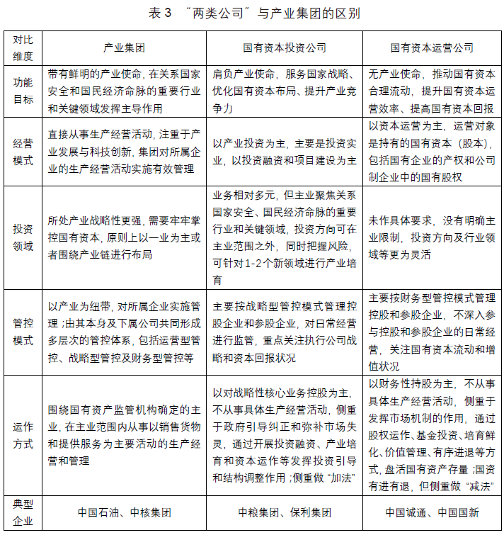 具體而言,“兩類公司”與產(chǎn)業(yè)集團(tuán)在功能目標(biāo)、經(jīng)營模式、投資領(lǐng)域、管控模式、運(yùn)作方式等方面存在著區(qū)別(見表3)。