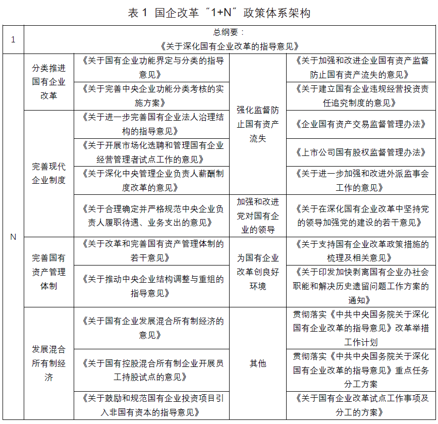 黨的十八大提出全面深化市場經(jīng)濟(jì)體制改革,完善各類國有資產(chǎn)管理體制。黨的十八屆三中全會通過的《關(guān)于全面深化改革若干重大問題的決定》首次提出“國有資本投資、運(yùn)營公司”概念,為國有資產(chǎn)管理體制改革定下“管資本”導(dǎo)向。2015年,黨中央、國務(wù)院印發(fā)綱領(lǐng)性文件《關(guān)于深化國有企業(yè)改革的指導(dǎo)意見》,并在隨后出臺了22個配套文件,從總體要求到分類改革、完善現(xiàn)代企業(yè)制度和國資管理體制、發(fā)展混合所有制經(jīng)濟(jì)、強(qiáng)化監(jiān)督防止國有資產(chǎn)流失等方面,提出了國企改革的目標(biāo)和舉措,形成了“1+N”系列指導(dǎo)方案,為新時代國企改革搭建了“四梁八柱”(見表1)。