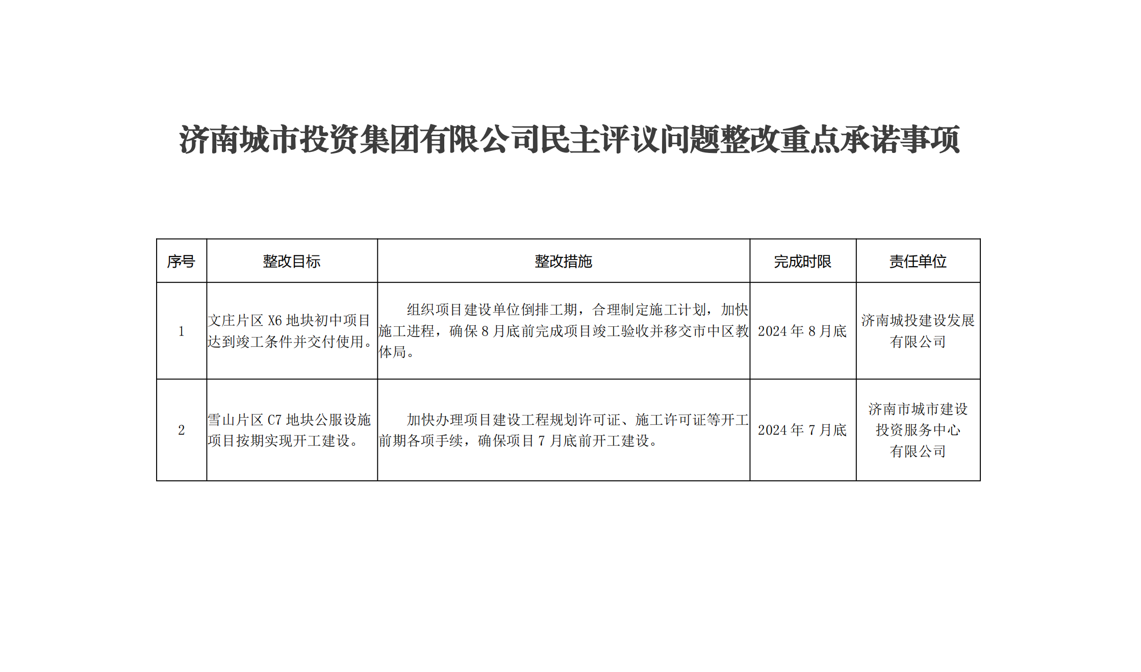 濟(jì)南城市投資集團(tuán)有限公司民主評(píng)議問題整改重點(diǎn)承諾事項(xiàng)