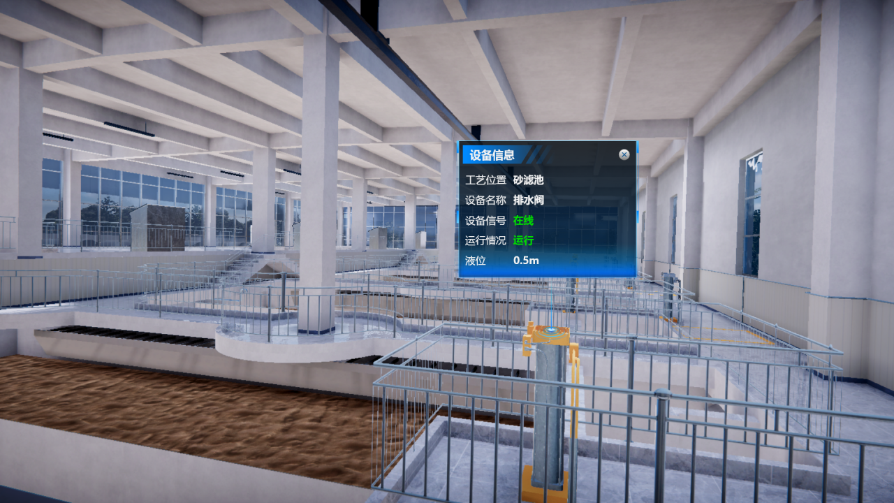 在起步區(qū)水廠數(shù)字化中心,三維數(shù)字化全景把“實(shí)體空間”和“虛擬呈現(xiàn)”完美地融合在了一起。通過傳感器采集“實(shí)體空間”生產(chǎn)制造過程中的所有實(shí)時(shí)數(shù)據(jù),能直觀掌握相關(guān)設(shè)備儀器的工作狀態(tài),以三維可視化的形式同步觀察、檢測工藝流程上每臺(tái)被檢設(shè)備所處的狀態(tài)。系統(tǒng)還可以任意選取虛擬場景中的相關(guān)物品,對(duì)其屬性、狀態(tài)、行為等參數(shù)進(jìn)行查看,促進(jìn)廠區(qū)高效運(yùn)行。